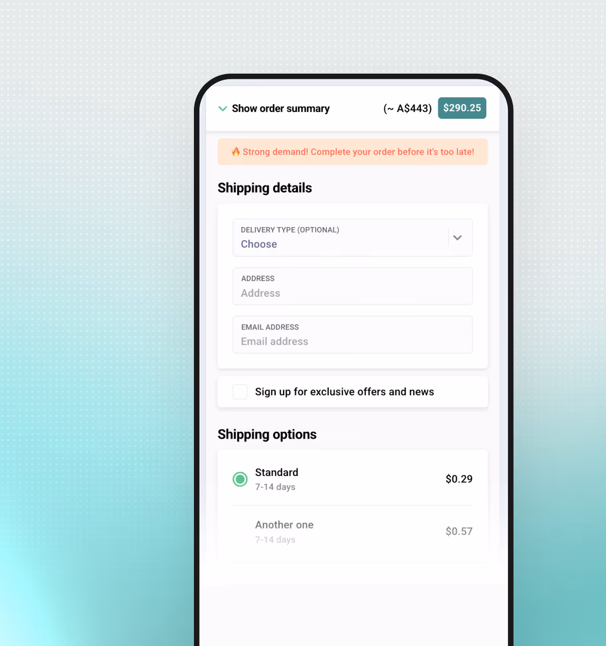 Create your unique shipping (delivery) address form for countries and products. Test to find the most converting one. Read more