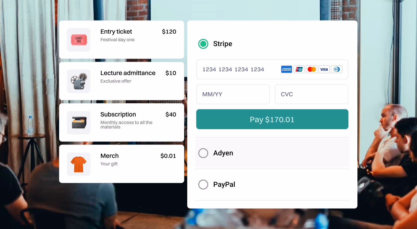Collect payments in a fast and secure way with popular payment gateways integrations such as Stripe (incl. local and alternative payment methods like iDEAL, Klarna, Afterpay, and etc.), PayPal, Binance, Airwallex (soon). Read more